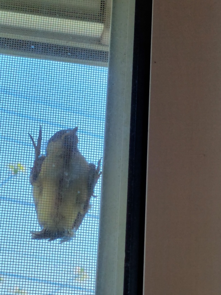 なんと、網戸に鳥がへばりついている!