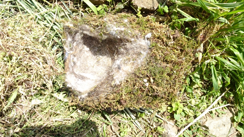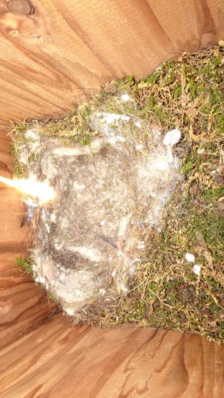 巣は、中を出してみると、ふわふわの苔がしっかり10cmぐらい積み上げてあって、その真ん中に5cmぐらいの深さの半球の窪み。窪みには、羽毛とか、毛とかがまた敷いてある。なんとも凝った作り。
