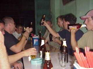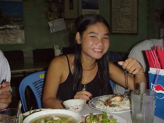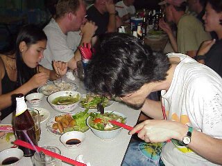 In a restaurant in ChauDoc. Tour mates are pigging out (left). A Vietnamese girl in the tour (lower left) A Japanese man observing the food(lower right), |