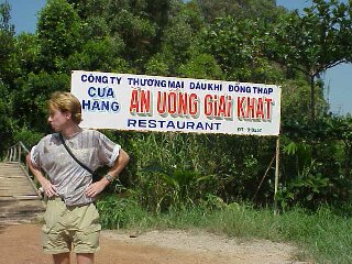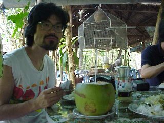 A restaurant is a hut on water. Its roof is made with palm leaves. A coconut juice in front, unlike in Saigon, its outside is not peeled. | |