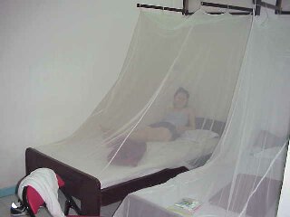 In Thanh Tra Hotel in ChauDoc. Mosquito nets are prepared for guests. Address is 77 Thu Koa Nghia, Thi Xa, Chau Doc. ChauDoc is a quiet and peaceful country town. A lot of people cool down around a square at night. |