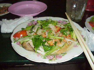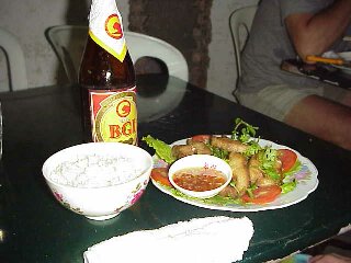 A Chinese restaurant in CanTho in Mekong (upper left). A statue of young Ho Chi Minh in a park on the riverside, near the restaurant (upper right). Spring rolls and Vietnamese Beer, BGI. BGI is capitalized by Foster, an Australian company (Left) Squid and vegetables fries are decent (lower left). They serve snakes here (lower right). |